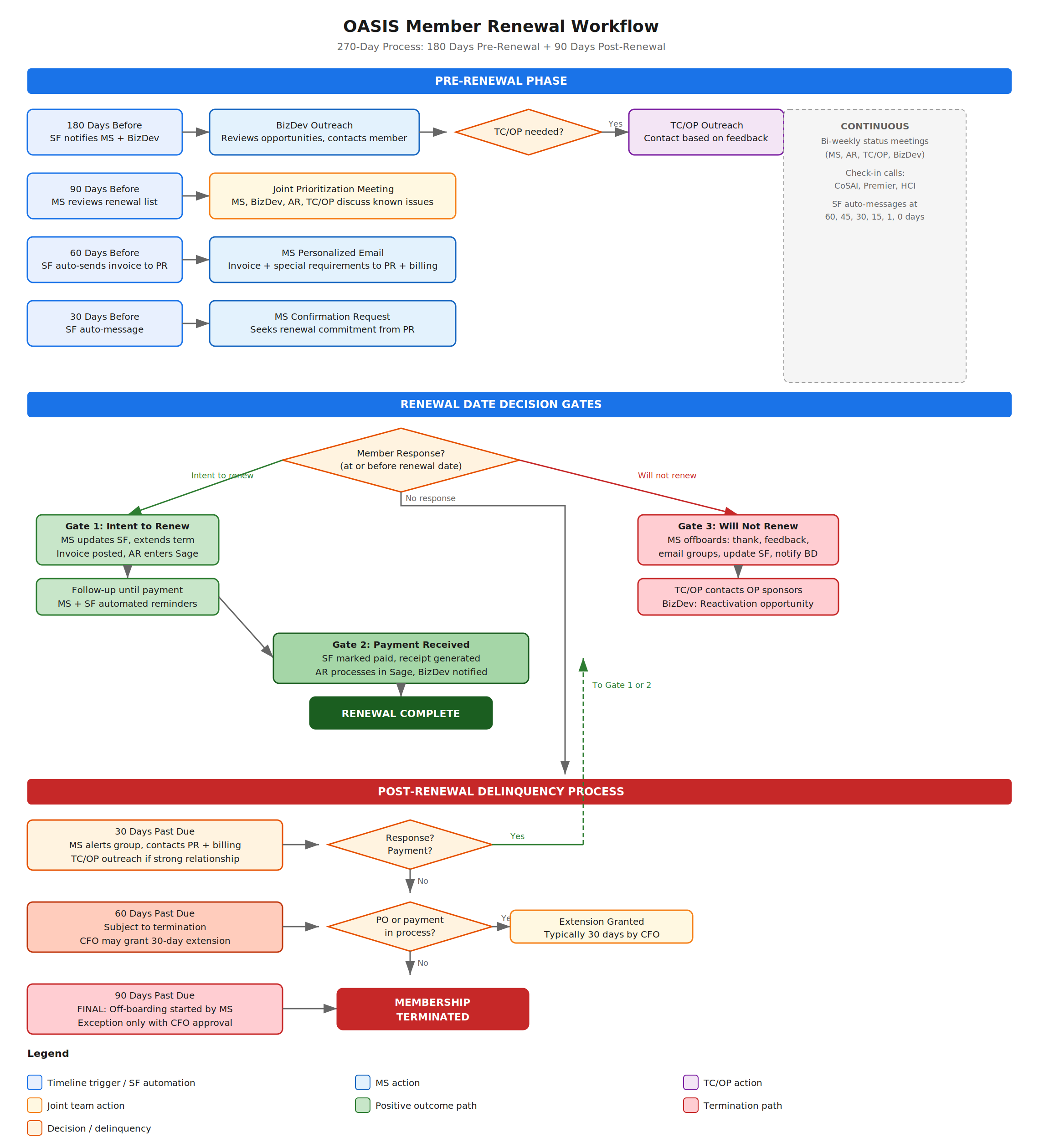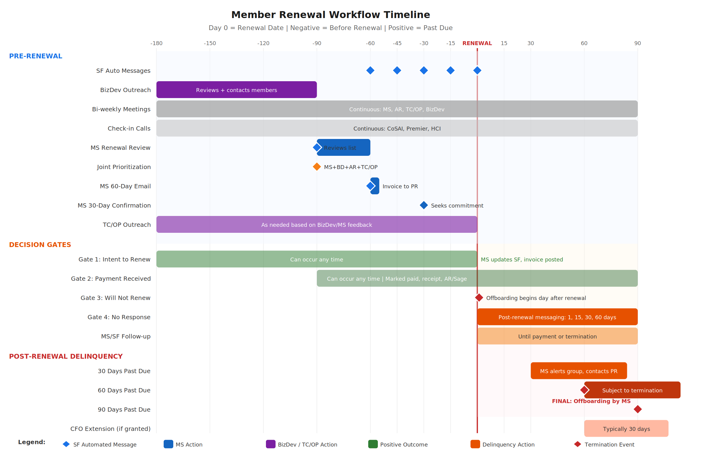 This workflow manages Member renewals from initial outreach through payment or termination. The process spans approximately 270 days total (180 days pre-renewal plus 90 days post-renewal) with multiple touchpoints and decision gates. This document covers the Overall Workflow Timeline applicable to both TC and OP renewals.