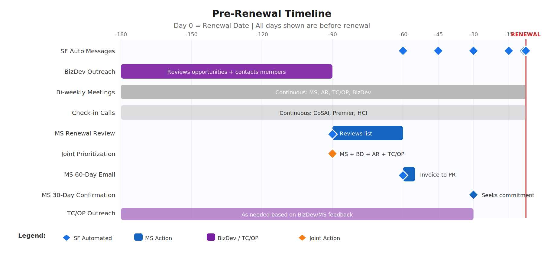 Bi-weekly renewal status meetings are held, including MS, AR, TC/OP, and BizDev to discuss pending renewals and coordinate outreach. (See Appendix A for proposed quarterly account review meetings.)