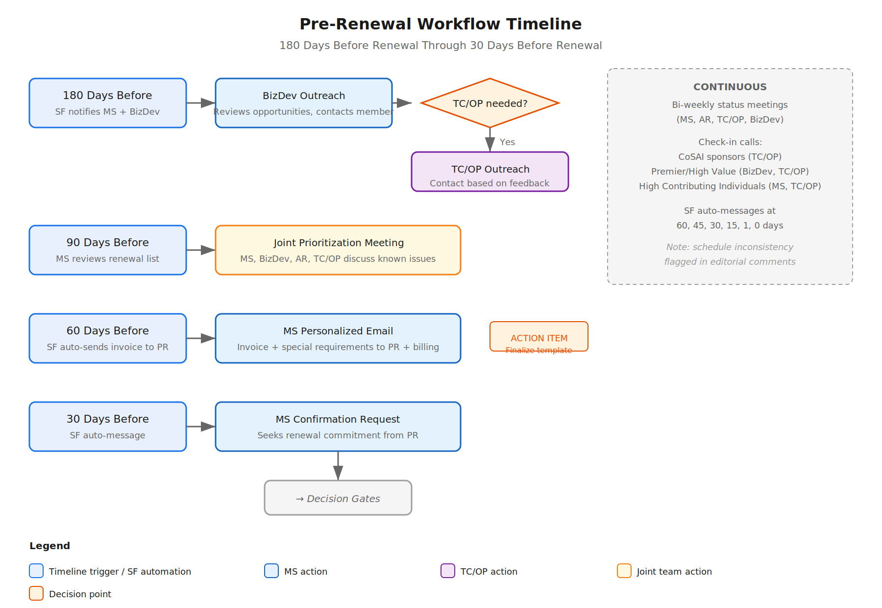 BizDev reviews automated 180-day renewal opportunities generated in SF. BizDev begins an outreach opportunity and determines if TC/OP needs to make contact based on feedback. (See Appendix A for proposed automation of this manual review step, and Appendix A for proposed additional BizDev headcount.)