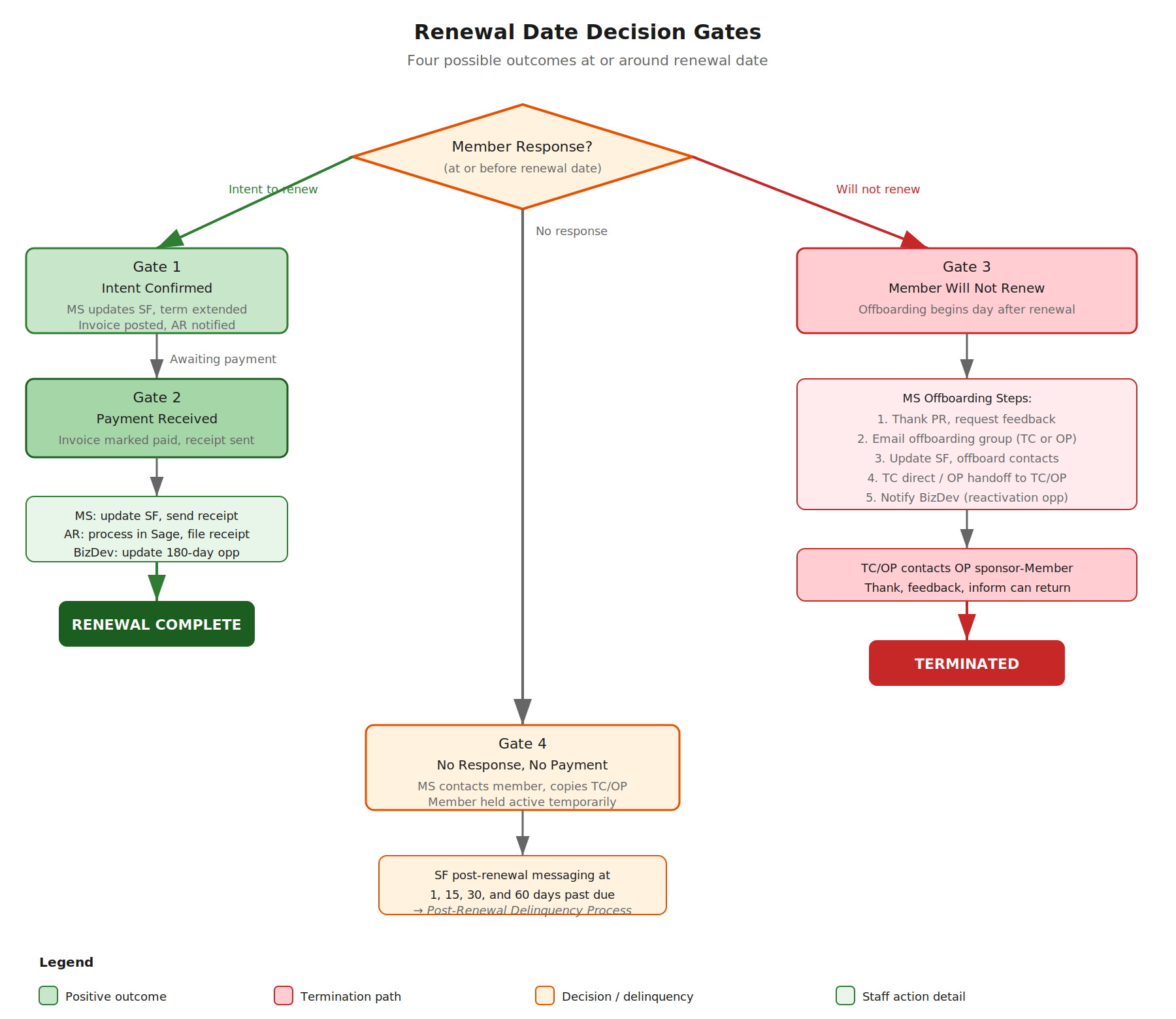 Action: MS contacts Member by email (with a copy to TC/OP), reminding the Member that they must confirm their intent to renew, and that payment is required to remain in good standing.