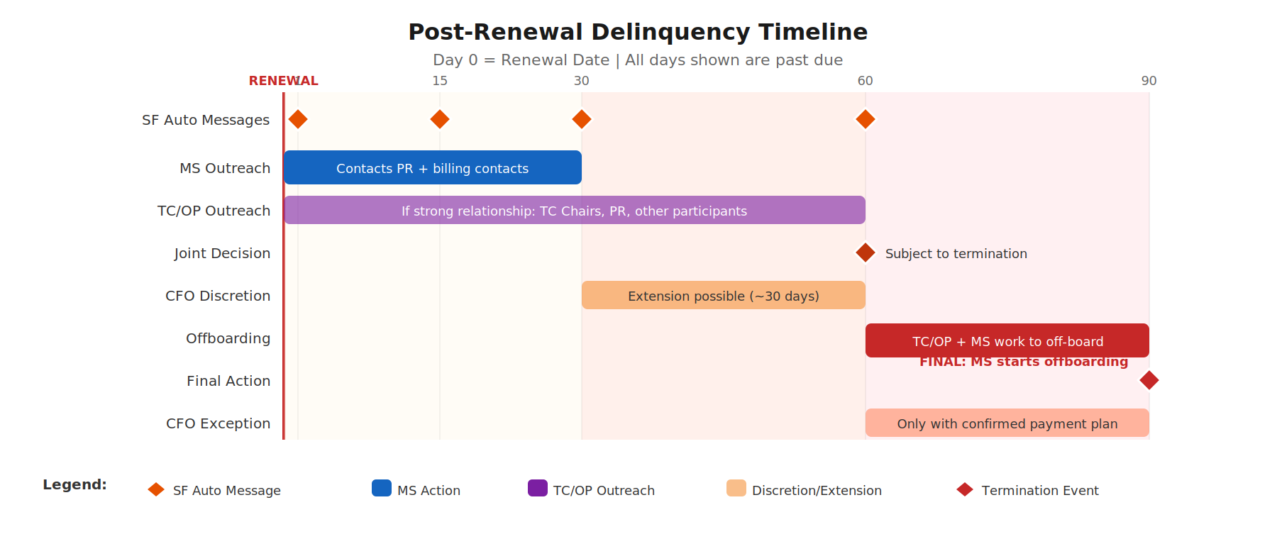 During the bi-weekly meetings, MS alerts the renewal group of delinquent accounts status: