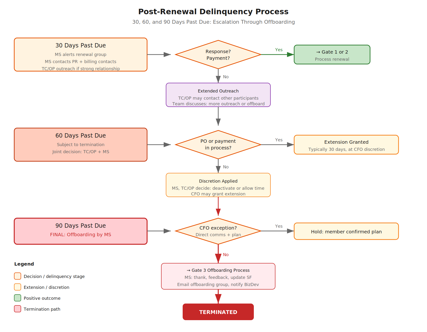 When a member has not paid within the standard timeline, the CFO, MS, and TC/OP jointly decide whether to grant additional time (typically 30 days) to, for example, TC Chairs, Project chairs, or others.